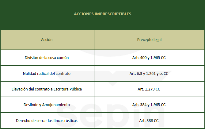 - Las acciones imprescriptibles: En este cuadro enumeramos las acciones que tienen tal carácter: